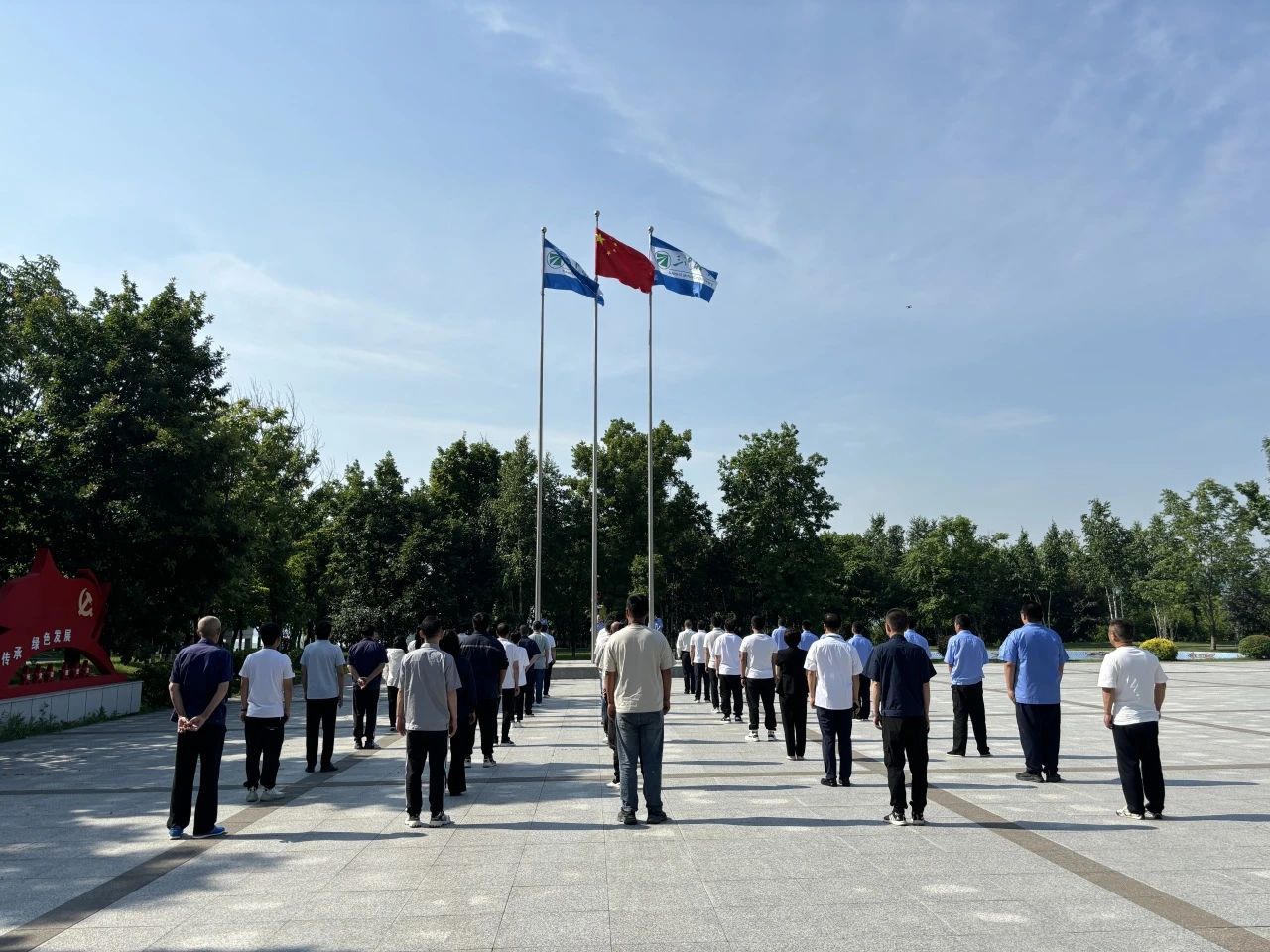 国歌琅琅,激扬着我们的梦想;余音袅袅,回荡着我们的决心。7月1日,伴随着雄壮的国歌,鲜艳的五星红旗冉冉升起、迎风飘扬,公司中层以上干部、全体党员及积极分子面向国旗,共同表达对党、对祖国的忠诚和热爱。